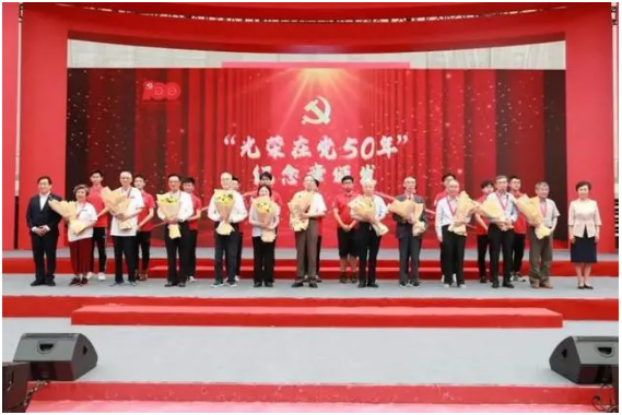 昂扬的歌声通过EV音响系统撼动了在场所有人的心灵,将主题党日活动推向高潮。活动最后,在100位新入党党员接力下,一面党旗在内场缓缓展开。这面党旗在复旦飘扬了一百年,象征着共产党人的精神和力量,是复旦人的信仰和方向。